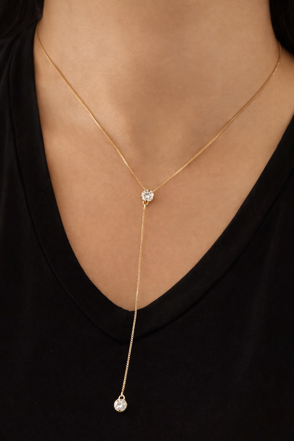 Sutil, luminoso y lleno de elegancia. Este collar chapado en oro de 22kt, presenta un delicado diseño en forma de Y con dos circonias creando un efecto de brillo en movimiento. Fabricado con materiales nobles e hipoalergénicos, es tan cómodo como sofisticado.